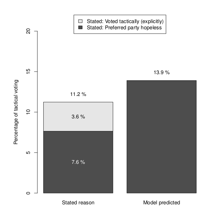 A paper entitled Separating Tactical from Sincere Voting: A Finite-Mixture Discrete-Choice Modelling Approach was presented at the Annual Conference of the Midwest Political Science Association 2014 in Chicago, Ill. It presents a novel approach to uncover tactical voting from responses in electoral survey studies. The basic idea is that the distribution of observed voting decisions is a finite mixture of non-tactical (aka sincere) and tactical voting decisions, where tactical voting decisions are characterised by choosing - in stead of the full choice set - from a restricted consideration set. This restricted consideration set then contains only those alternatives (e.g. parties’ candidates) that are considered viable by the voter in her respective constituency or voting district.